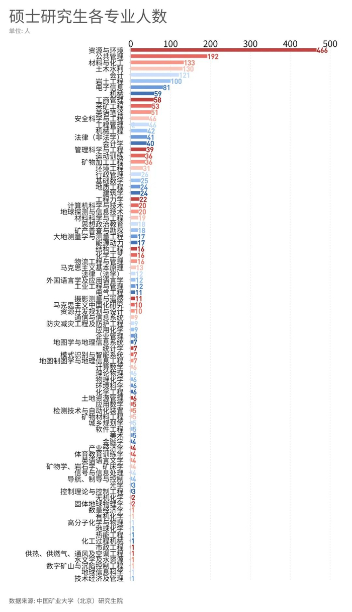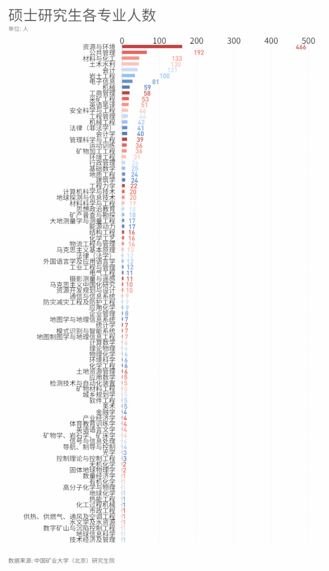 硕士录取人数TOP10专业:资源与环境、公共管理、材料与化工、土木水利、会计、岩土工程、电子信息、机械、工商管理、采矿工程。