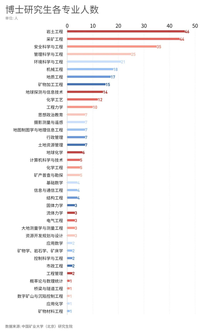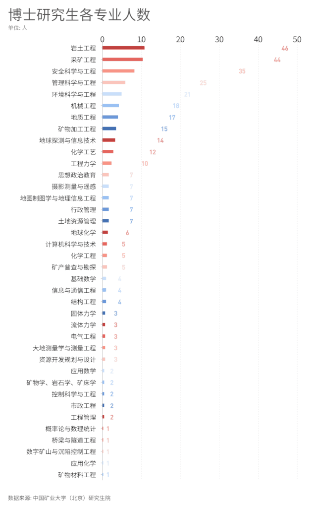 博士录取人数TOP10专业:岩土工程、采矿工程、安全科学与工程、管理科学与工程、环境科学与工程、机械工程、地质工程、矿物加工工程、地球探测与信息技术、化学工艺。