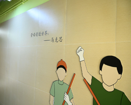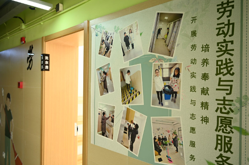 “劳”:洗衣房、自助厨房、社区义务劳动岗。挖掘学生日常生活中的劳动教育资源,在社区内设置劳动实践锻炼机会,设置垃圾分类督导员、宿舍安全检查员、宿舍卫生检查员等实践岗位,让劳动教育在学生学习与生活的点滴中体现,让劳动教育成果在学生的学习与生活的点滴中呈现。