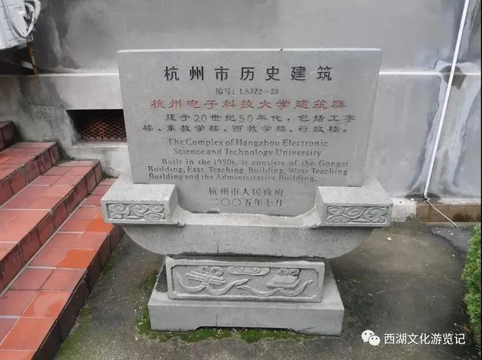 该建筑群主楼,据说曾经是二十军军部首长的办公楼。1973年,我刚进校读书时,主楼东、西两侧各有一座绿色的、哨兵站岗的亭子;主楼背后(北面)草坪上的假山下,有一个防空洞的进口,防空洞的另一个出口在原杭电东北角的假山下(现为银马公寓前的“百年树人”石碑处)。