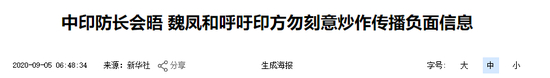 二是中方最先发布此消息的新华社内外两个新闻稿件内容相同但使用了不同的标题。新华社海外网对外发稿使用的标题是《中印防长会晤 魏凤和呼吁印方勿刻意炒作传播负面信息》,而新华社对内发稿使用的标题是比较中性的《中印国防部长在莫斯科举行会晤》。