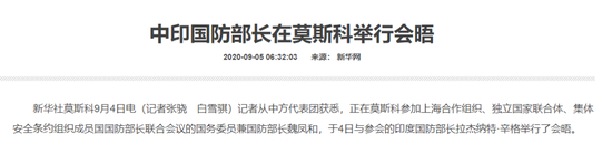 据中印两国媒体的报道,9月4日,在莫斯科参加上海合作组织等多边组织成员国国防部长联合会议的中国国务委员兼国防部长魏凤和与印度国防部长拉杰纳特·辛格举行了会晤。根据印度媒体援引印度国防部长办公室(RMO India)官方发布的信息,双方会晤持续了2小时20分钟。