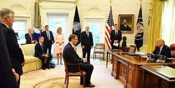 此前,根据路透社的报道,9月4日的这场协议签署仪式,原本计划在白宫的罗斯福厅举行。会场内只架设了两张桌子,供武契奇和霍蒂就坐签署协议。但白宫方面临时将仪式的举办地从罗斯福厅转移至椭圆形办公室,让武契奇和霍蒂坐在特朗普两旁。