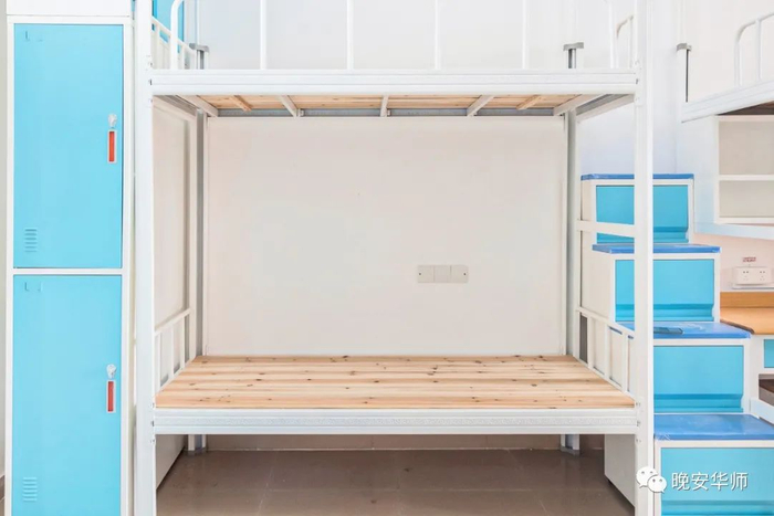 每间标准学生宿舍配备6个大柜,一侧3个分立宿舍两侧,两张书桌共设6个抽屉,12格书架。抽屉与大柜子均可上锁。宿舍两侧用于上下床的阶梯内还隐藏着一定储物空间,巧妙利用各个角落实现收纳功能!