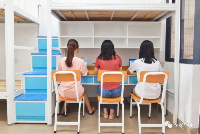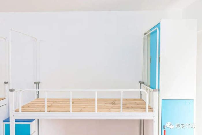 标准六人间,每间宿舍采用的是“两连体三人位”的组合家具模式,即两套上下床、两套上床下桌,床位长2米、宽0.9米。宿舍内部简约蓝白色彩设计,绝佳的视觉体验让同学们回到宿舍倍感放松。