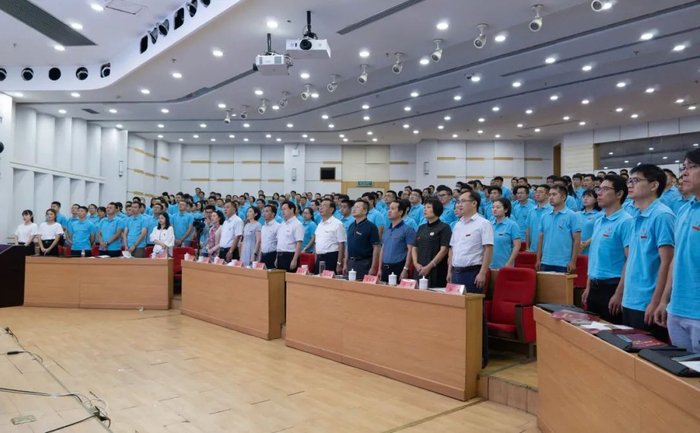 ▲在国家自然科学基金优秀青年基金获得者、化学化工学院韩杰教授的带领下,新入职教师们进行了入职宣誓庄严的仪式。无悔的承诺是青年人的担当,亦是教书育人的责任!