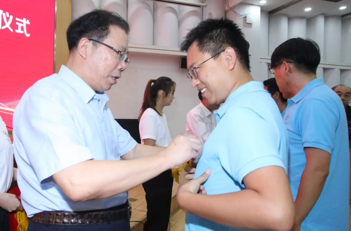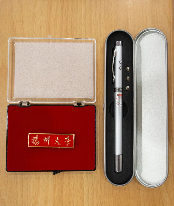 ▲校党委书记姚冠新、校长焦新安为新入职教师代表佩戴校徽。当刻有“扬州大学”字样的校徽佩于胸前,标志着全体新入职教师正式加盟扬州大学大家庭!