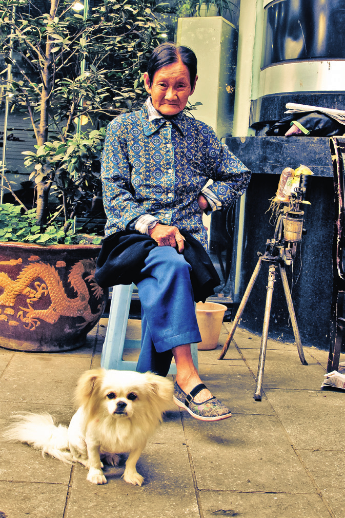 解放碑的一条巷子里,一个老婆婆坐在缝纫机旁,身前还有一条小狗;