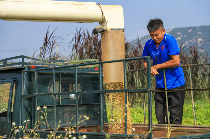 村民李彪家今年使用收割机收稻,收割机经过之处水稻被迅速割除,水稻秸秆被搅碎撒回田间。两三圈下来,收割机停靠在稻田边,通过机器自带的“输粮管”将收割下来的谷子输送到一旁的运粮车里。李彪说,收割机收割稻谷比较快,而且省事,收割稻谷每亩价格150元,比人工收割要划算得多。