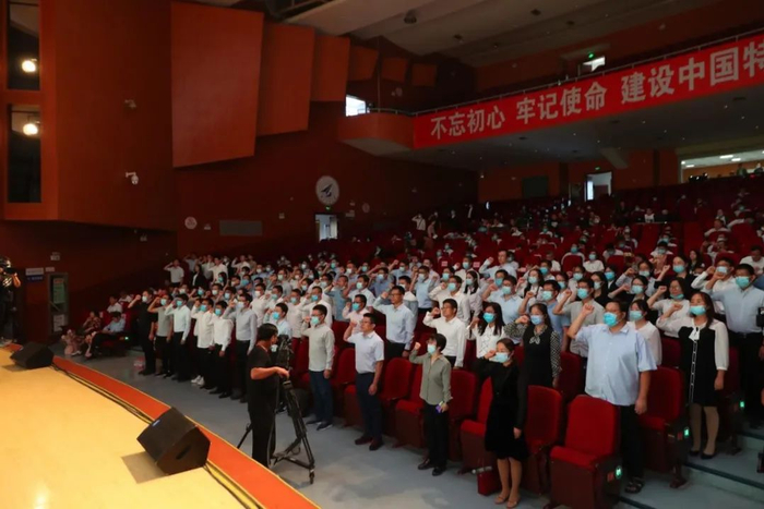随后,在董华超领誓下,全场青年教师庄严宣誓。铿锵有力的宣誓声表达了他们要做一名“四有”好老师的决心。