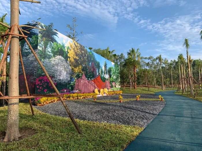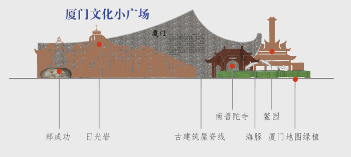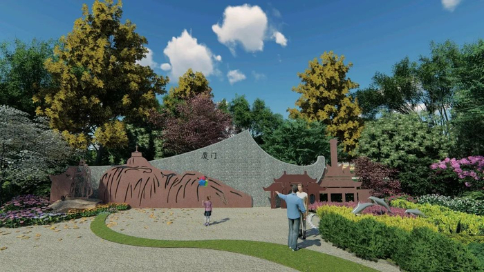 厦门园区的文化小广场占地约260平方米,小广场会采用具有代表性的厦门文化元素如:郑成功、日光岩、古建筑的屋脊线、南普陀寺、鳌园等进行艺术化的处理,通过耐候钢板进行雕刻厦门文化。广场小而精,在不破坏生态植物园的前提下,概括性地展现厦门的人文历史和植物特点。