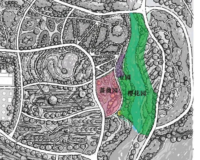 龙岩园区文化小广场的周边可集中展示龙岩具有代表性的乔灌木和果树等。