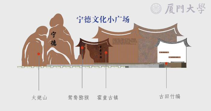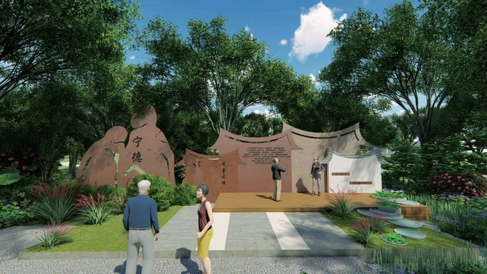 宁德园区的文化小广场占地约300平方米,小广场会采用具有代表性的宁德文化元素如:太姥山、霍童古镇、古田竹编、鸳鸯猕猴等进行艺术化的处理,通过耐候钢板进行雕刻展现宁德文化,广场小而精,在不破坏生态植物园的前提下,概括性地展现宁德的人文历史和植物特点。