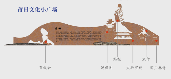 莆田园区的文化小广场占地约300平方米,小广场会采用具有代表性的莆田文化元素如:菜溪岩、妈祖阁、大雄宝殿、南少林寺、木兰溪等进行艺术化的处理,通过耐候钢板进行雕刻展现莆田文化,广场小而精,在不破坏生态植物园的前提下,概括性地展现莆田的人文历史和植物特点。