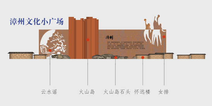 漳州园区的文化小广场占地约300平方米,小广场会采用具有代表性的漳州文化元素如:云水谣、火山岛、怀远楼等进行艺术化的处理, 通过耐候钢板进行雕刻并与火山石相结合等建筑手法展现漳州文化,广场小而精,在不破坏生态植物园的前提下,概括性地展现漳州的人文历史和植物特点。