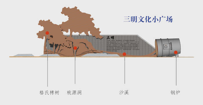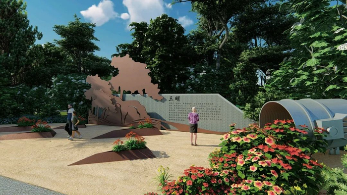 三明园区的文化小广场占地约300平方米,小广场会采用具有代表性的三明文化元素如:桃源洞、沙溪、钢炉等进行艺术化的处理,通过耐候钢板进行雕刻展现三明文化;广场小而精,在不破坏生态植物园的前提下,概括性地展现三明的人文历史和植物特点。
