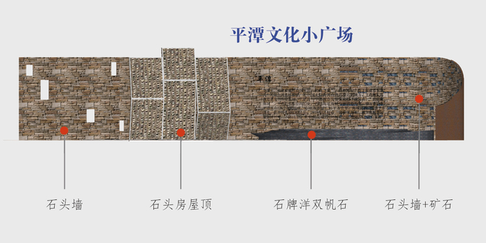平潭园区的文化小广场占地约300平方米,小广场会采用具有代表性的平潭文化元素如:石牌洋双帆石等进行艺术化的处理,通过石头墙、平潭特色石头房屋顶、矿石铺贴等建筑手法展现平潭文化,地面处理增添了平潭部分地图,广场小而精,在不破坏生态植物园的前提下,概括性地展现平潭的人文历史和植物特点。
