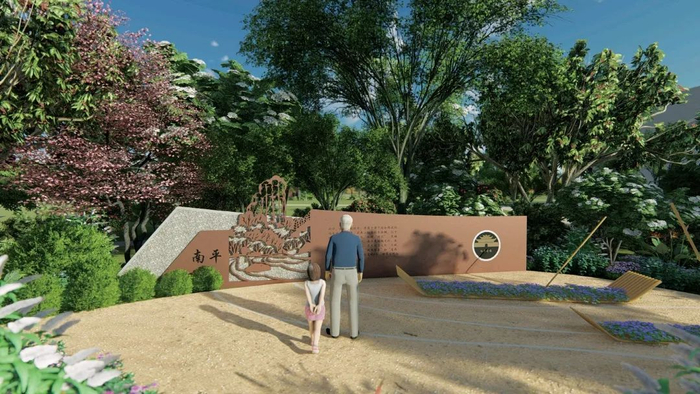 南平园区的文化小广场占地约300平方米,小广场会采用具有代表性的南平文化元素如:武夷山、和平古镇等进行艺术化的处理,通过耐候钢板进行雕刻并与石笼、竹排等相结合展现南平文化,广场小而精,在不破坏生态植物园的前提下,概括性地展现南平的人文历史和植物特点。