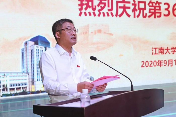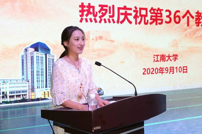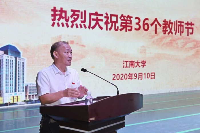 “至善教学名师奖”获得者、纺织科学与工程学院徐阳老师作为教师代表发言,他回顾了与江南大学37年的深厚情缘,现场分享了一名平凡却不普通的高校教师坚守初心、传承师道、砥砺前行的心路历程。