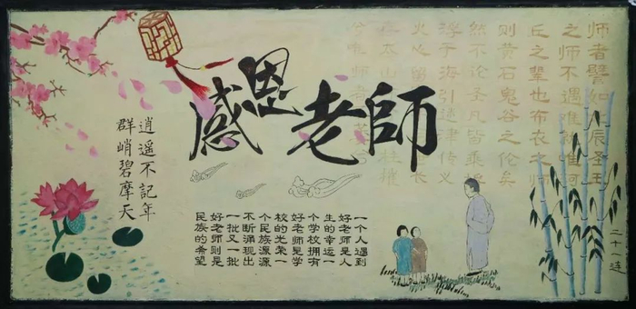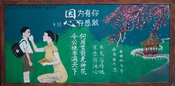 在我们的教室,每一个求学的日子里,老师,写尽六艺之妙,说尽数理之奥,温暖三千桃李,培养百年树人。而桌上的花,便是在这个特殊的日子里,我们对老师的深情告白。板报的陪衬部分是窗外,阳光明媚,绿杨成荫,曾经的小树苗,都已聚木成林,蜿蜒到远方。进一步与主体呼应,象征着在老师的陪伴下,我们都成为栋梁之材,走向更远的世界。