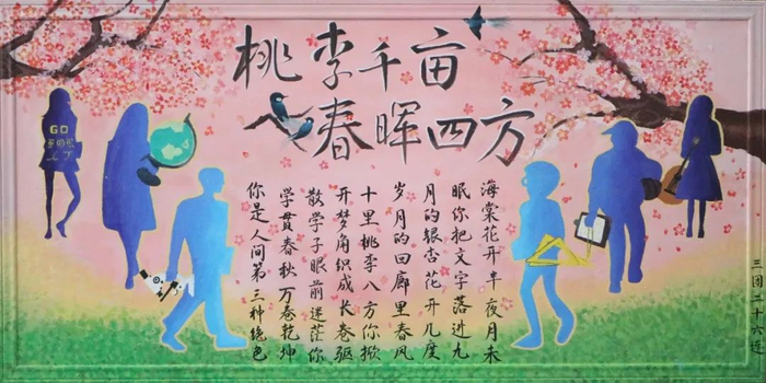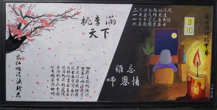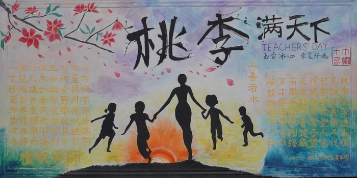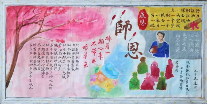 板报以“桃李千亩,春晖四方”为主题,以桃花烂漫、绿草如茵展现教学区优美环境,以诗歌歌颂老师辛勤育人,以人物剪影和科目用具展现各科老师学术风采,整体表达了学生对老师的赞美和爱戴。