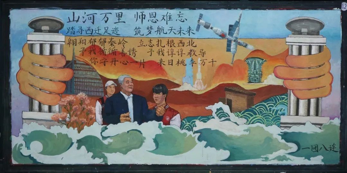 以我们的成长描绘老师对我们的恩情,初进校园,老师用手铺展新征程的画卷,画卷左侧是启真楼,让我们在新的校园环境下延续梦想的旅途,我们渐渐成长,正如画卷下侧的奔涌的后浪,一代更比一代强,成为建设祖国未来的新时代青年人,图中央的老教授正在向工大学子讲述“过去的事情”,体现了老一辈航天工作者的无私奉献精神,吾辈当以为楷模。