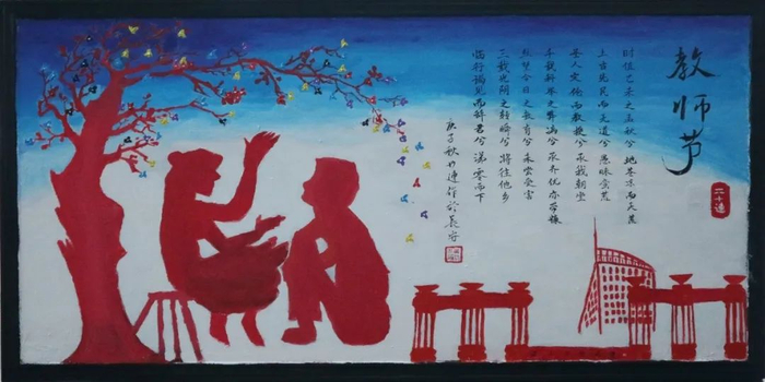老师的剪影寓意“老师用勤劳的汗水浇灌求知若渴的我们”。两名少先队员正书写“师恩难忘”,表达“教诲如春风,师恩深似海”的感激之情。我们铭记老师“教谆谆而明道”的引路之恩,和“赋予美好,授予希望”的匠心。