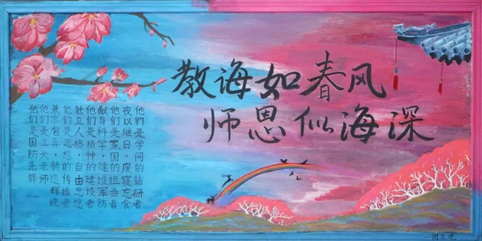 以“感谢师恩”为主题,板报以桃花粉、航空蓝两色为主体,左面桃枝和右侧屋檐下,远处一片象征着老师神圣职业的桃林。桃林之中一轮彩虹架空,鹿与飞鸟借彩虹之势跃向蓝天,好似西工大学生在老师的教导下实现梦想,逐梦蓝天。