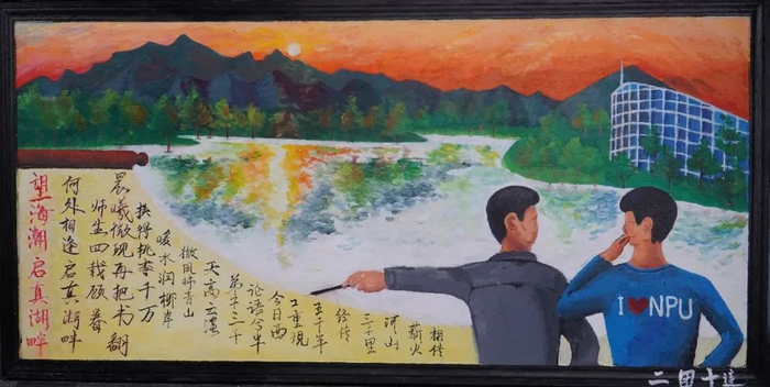 左上桃花灿烂,寓恩师学子满园;草坪上红日生辉,寓学子希望无限;剪影中师生携手,仿佛走向光芒万丈的未来;右部一首工大学长的小诗情深意浓,与万点斑斓的底色相呼应。