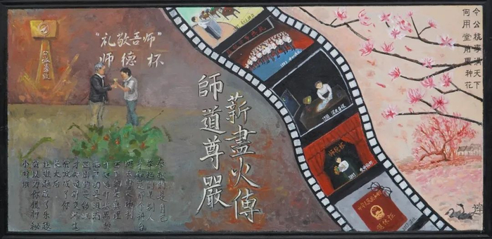 “落红化泥沃新花,丹心燃烛耀中华”蒙太奇的描述手法,右侧是一位已戴银丝的老师在残烛的映照下备课,窗外是满天繁星,墙上的日历显示着这个特殊的日期;左侧为飘落的桃花化为春泥,肥沃着满树新花。鹤发银丝映日月,丹心热血沃新花。此生难忘师恩情,惟愿桃李满天下。