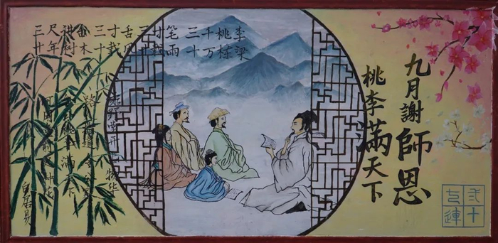 板报采用第一人称视角:站在密竹前透过月光门,一位长者山间讲学,所教弟子男女老少,上至达官下至平民,象征着教师“师爱为魂,学高为师,身正为范”。值此“礼敬吾师”之际,二十七连用一幅“九月谢师恩,桃李满天下”,致敬工大最美的人!