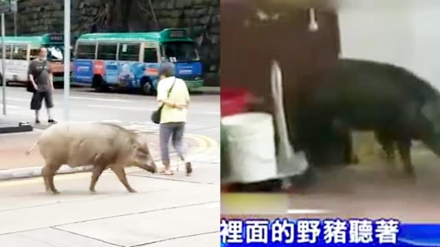 原标题:现场!香港街头再现壮硕野猪 已成港警最大对手:里面的野猪听着