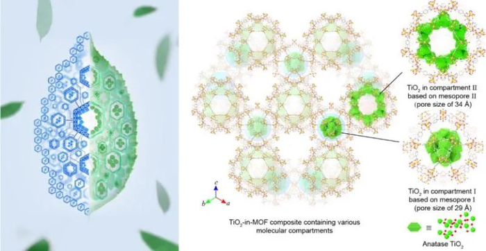 邓鹤翔课题组从材料的合成角度出发,创造性的探索了在介观尺度上(2-50纳米),无机半导体纳米颗粒和金属有机框架(Metal organic framework, MOF)孔道界面的分子定制,实现了单波长光驱动下CO2还原11.3%的表观量子产率(Apparent quantum efficiency),并观察到等当量O2的释放。此分子定制界面的构筑类似于叶绿体中光催化基元的局域化,所设计出的多种“分子隔间”(molecular compartment,I型和II型)能够实现二氧化钛纳米颗粒化学环境的精准定制,从而大幅提高光生电子的分离和利用。CO2光还原实验表明,TiO2与MOF骨架所构筑的三维有序结构(TiO2-in-MOF)的光催化活性远高于同尺寸的TiO2纳米颗粒及MOFs表面负载的TiO2,充分展示了“分子隔间”的结构优越性。