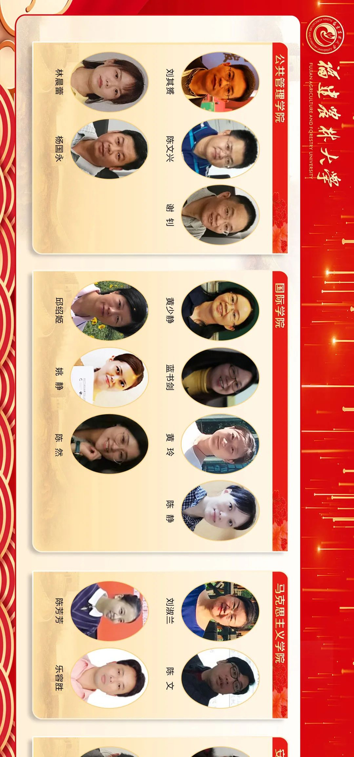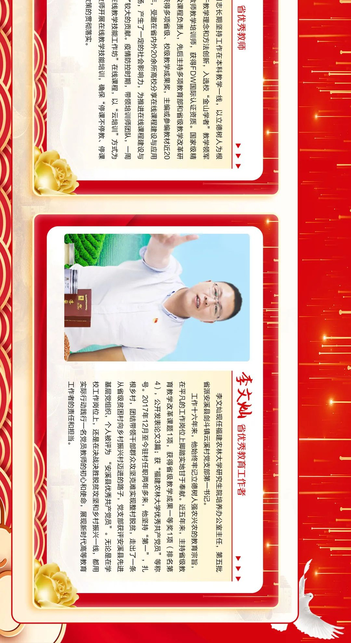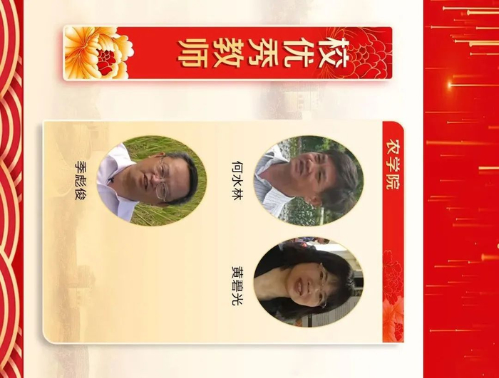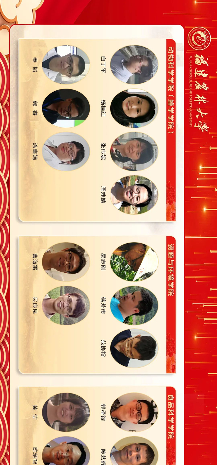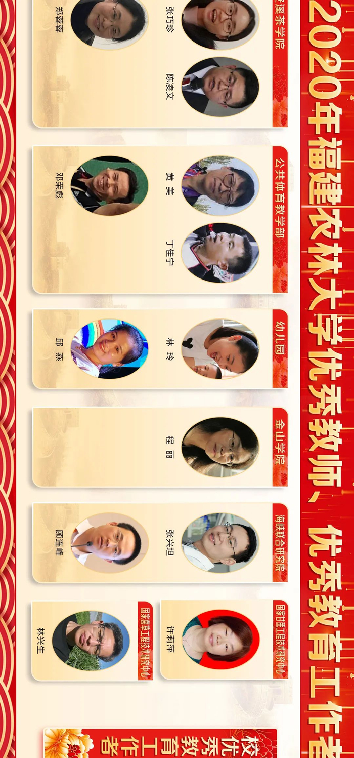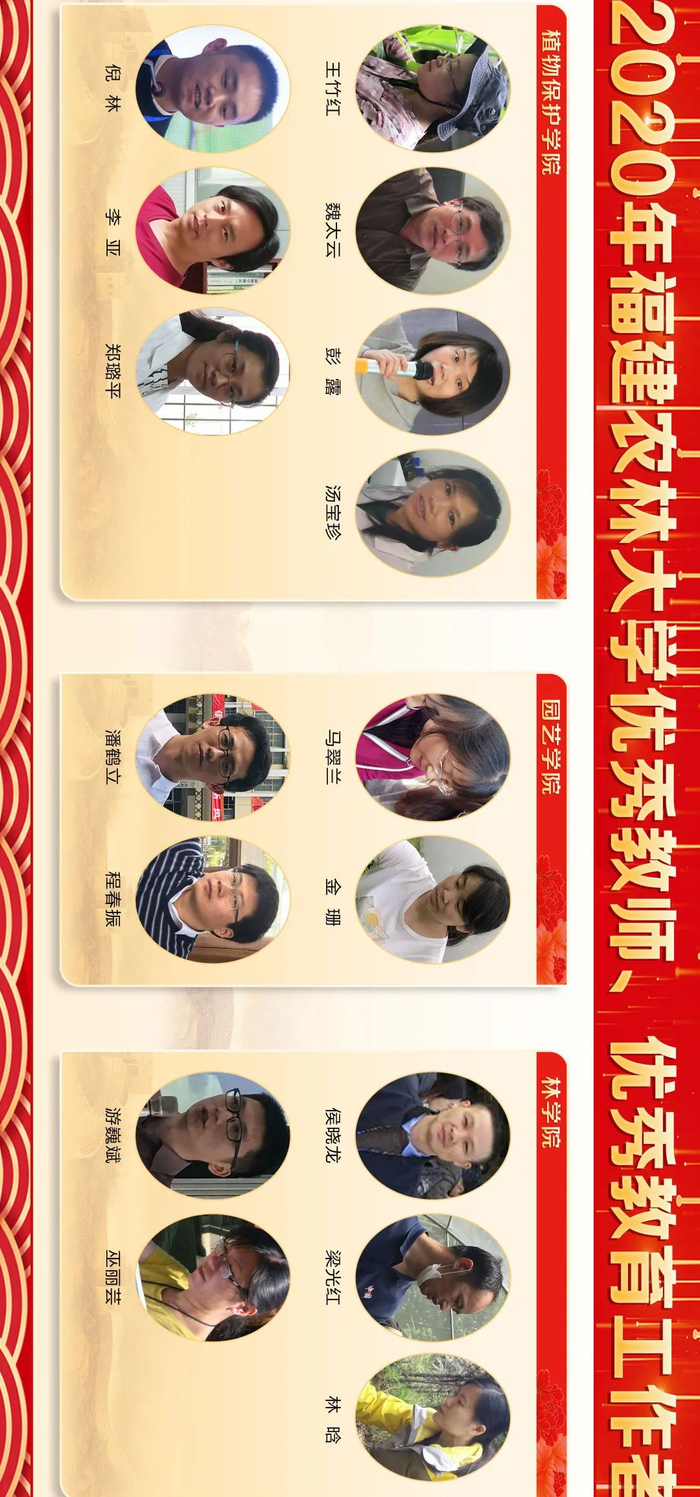 来源:福建农林大学三尺讲台勤耕耘,一片丹心育桃李。第36个教师节之际,学校隆重表彰一批在教育教学工作中辛勤耕耘、默默奉献的教学名师、优秀教师、优秀教育工作者、优秀辅导员和优秀班主任,6位同志获“校教学名师”荣誉称号,111位同志获“校优秀教师”荣誉称号,15位同志获“校优秀教育工作者”荣誉称号,30位同志获评“校优秀班主任”,10位同志获评“校优秀辅导员”。此前,省教育厅发布《福建省人力资源和社会保障厅 福建省教育厅关于表彰福建省优秀教师和优秀教育工作者的决定》,我校3位同志获评“福建省优秀教师”,1位同志获评“福建省优秀教育工作者”。