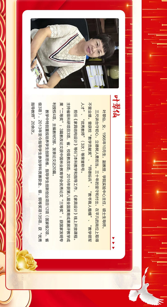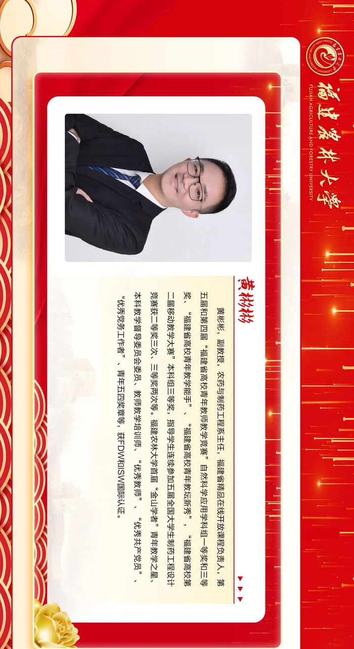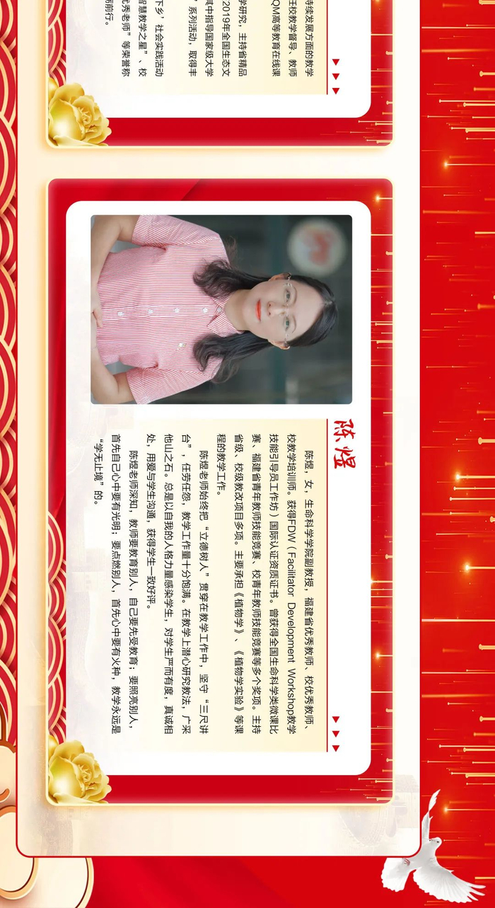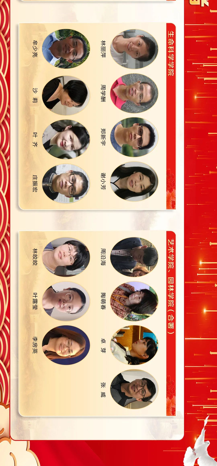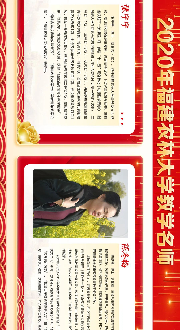 来源:福建农林大学三尺讲台勤耕耘,一片丹心育桃李。第36个教师节之际,学校隆重表彰一批在教育教学工作中辛勤耕耘、默默奉献的教学名师、优秀教师、优秀教育工作者、优秀辅导员和优秀班主任,6位同志获“校教学名师”荣誉称号,111位同志获“校优秀教师”荣誉称号,15位同志获“校优秀教育工作者”荣誉称号,30位同志获评“校优秀班主任”,10位同志获评“校优秀辅导员”。此前,省教育厅发布《福建省人力资源和社会保障厅 福建省教育厅关于表彰福建省优秀教师和优秀教育工作者的决定》,我校3位同志获评“福建省优秀教师”,1位同志获评“福建省优秀教育工作者”。