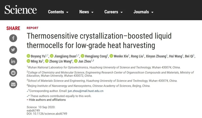 9月11日,《科学》(Science)以First Release形式刊发了武汉光电国家研究中心周军教授团队最新研究进展“Thermosensitive-crystallization boosted liquid thermocells for low-grade heat harvesting”。该研究工作第一署名单位为华中科技大学武汉光电国家研究中心,博士生余帛阳、段将将副教授为共同第一作者,周军为通讯作者。此外,论文合作者还包括武汉大学化学与分子科学学院丛恒将副教授、周军团队多名研究生(谢文科、柳容、庄欣妍、王卉、齐备)、华中科技大学材料科学与工程学院徐鸣教授和中国科学院北京纳米能源与系统研究所王中林院士等。
