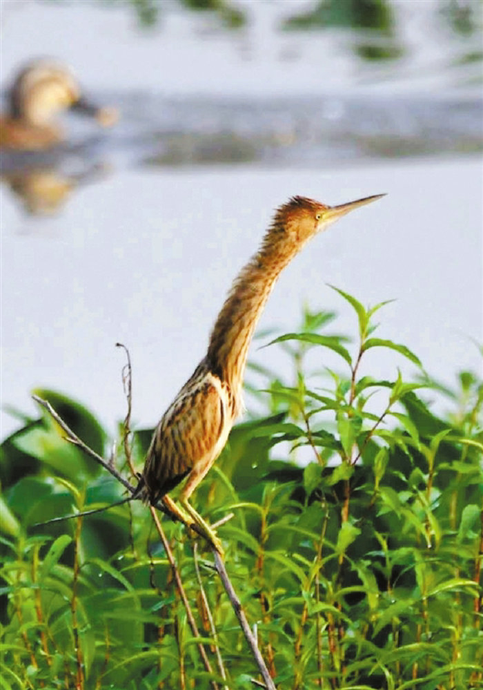 “它是涉禽,平常是很难看到的。脖子长腿也长,它的外表,对它的敌人和猎物,都是良好的保护色。”黄苇鳽觅食方式和其他鹭科鸟相似,一动不动耐心守候,发现猎物后突然攻击,用尖锐的长喙将鱼虾刺穿,堪称捕鱼能手。