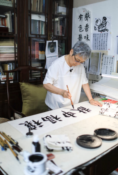 她在故宫写的字,很大一部分是功能性的,需要让老百姓看得清楚,又感觉美观。但她作为专业书法家,追求远不止于此。她以前常跟爱人画家杨刚讨论,书法能不能做到雅俗共赏。杨刚说,所谓大雅大俗,说到底就是返璞归真。至今她也没有答案,她努力做到的是,行家看到她的字能看出背后的功力,普通人看到会觉得美,觉得比电脑字好看。