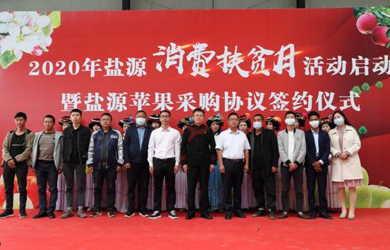 ▲广东(佛山)对口凉山扶贫协作工作组副组长、凉山州委副秘书长王志容(前排左六),盐源县委副书记、县长尹江涛(前排左七)等相关领导与苹果采购商代表、种植户代表与青年创业者代表共同启动本次盐源消费扶贫月。(摄影:张骞)