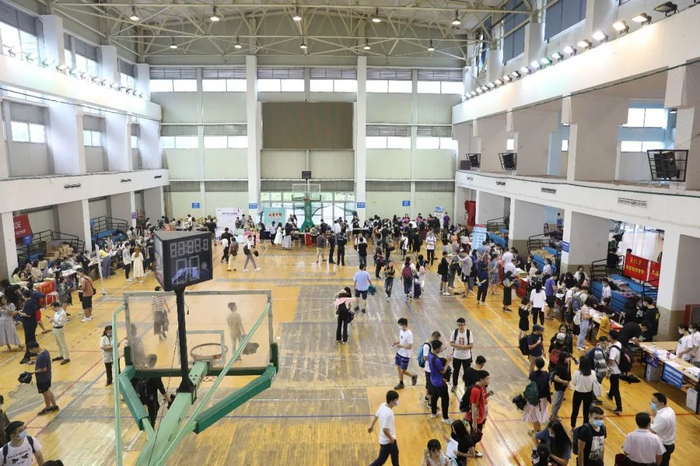 在枫林校区,为确保本次迎新工作顺利开展,上海医学院高度重视,在分管院领导牵头下,提前准备、周密部署,协调各相关职能部门多次召开工作会议,密切配合、落实到位。为统筹常态化疫情管理和教育教学工作要求,针对医科研究生新生报到集中的特点,今年首次启用游泳馆西侧连廊作为报到现场,半开放式空间既保证了通风,又避免了雨水对新生报到的影响。充足的报到空间、合理的报到流程,保证了各研究生培养单位以及相关职能部处清晰划分接待站点,新生报到工作安全有序、顺利开展。