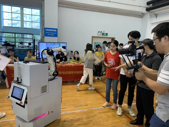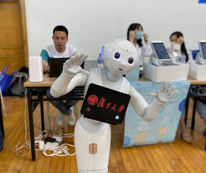 在今年“特殊”的迎新季,现场还有一台来自复旦大学工程与应用技术研究院智能工业机器人实验室的消毒机器人。它不仅可以实现大范围消毒,还可以实现对特定目标的定点、跟踪喷洒消毒及擦拭消毒。这款机器人不仅向新生们展示了人工智能的科研成果,还体现了科学研究与实际结合,适应社会需求的目标。