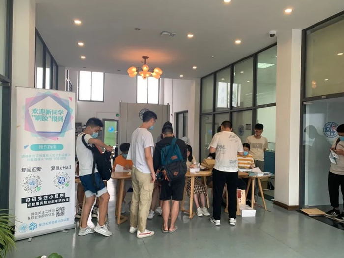 在张江校区,相关院系负责接待人员早早来到迎新现场,布置有关场地,并会同信息办老师安排好人脸识别自助报到,为新生们提供顺畅、高效、暖心的入学服务。