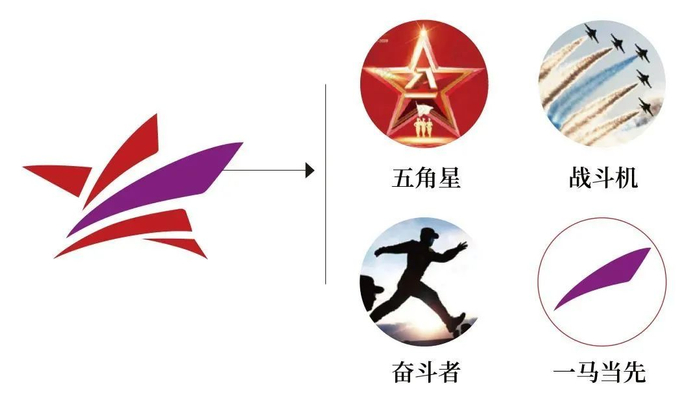 Logo正中间的图形融合了青春追梦的五角星、翱翔天空的战斗机、奔跑向前的奋斗者等元素,中间一条紫色线条寓意南理工人在“强大国防、繁荣祖国”的光荣征程中一马当先、大有作为。