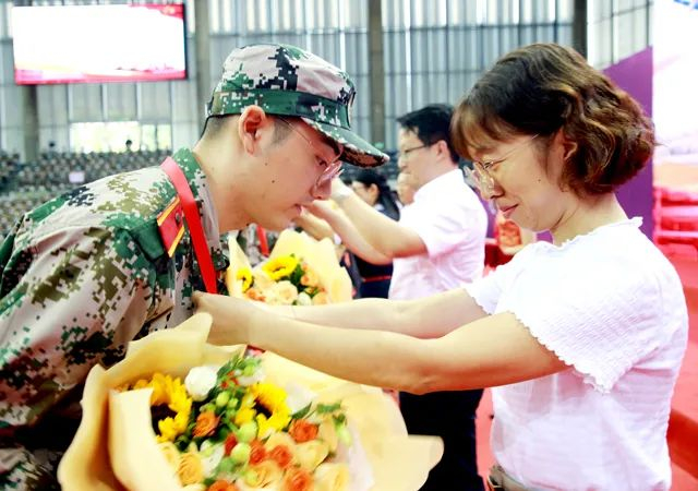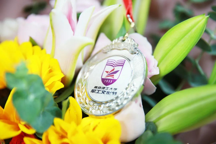 在军工文化传承环节,教师代表为新生代表佩戴印有文化节Logo的纪念章。