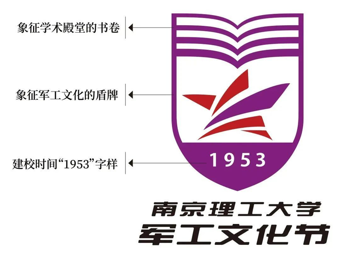 Logo图案以南理工紫为主色,它将南理工元素与“军工魂、报国志、青春行”的文化节主题融为一体。Logo主体含有校标中象征军工文化的盾牌、象征学术殿堂的书卷以及建校时间“1953”字样。