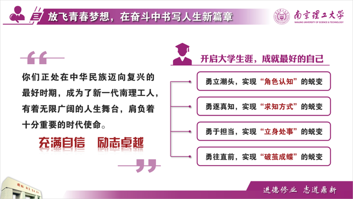付梦印校长从四个方面与同学们作分享:勇立潮头,实现“角色认知”的蜕变;勇逐真知,实现“求知方式”的蜕变;勇于担当,实现“立身处事”的蜕变;勇往直前,实现“破茧成蝶”的蜕变。