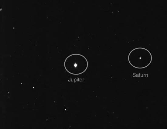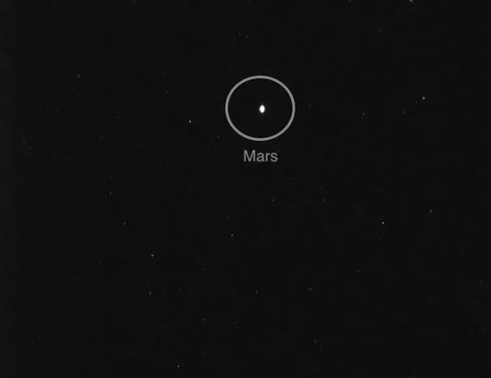 8月24日,阿联酋公布了两张希望号拍摄并送回地球的照片,一张照片显示漆黑星空中两个明亮白点,它们是木星和土星,另一张照片只显示一个明亮白点,它就是目的地——火星。