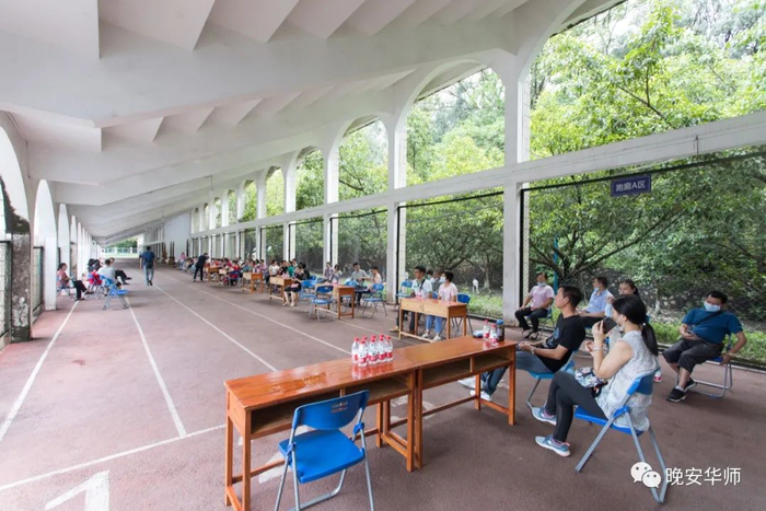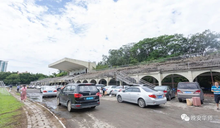 虽然家长不能入校,但石牌校区将南区田径场作为临时停车点,方便家长和学生停放车辆,并特地在其架空层为家长准备了座椅和水以供休息。