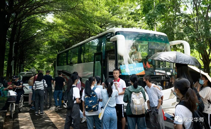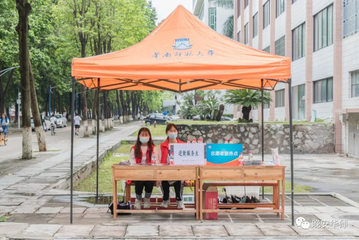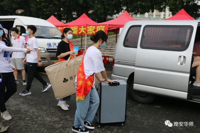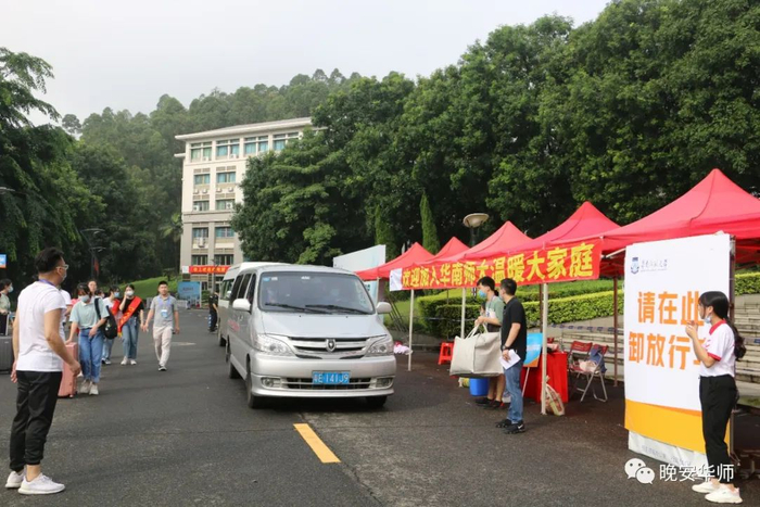 南海校区在车辆行进路线的中点,设置志愿服务点与学院引导处,服务点为新生与家长提供凉茶等消暑食品。另有多班行李车,不间歇地将新生送至体育馆与宿舍进行报到与休整,有效地防止了人群聚集,方便新生注册。