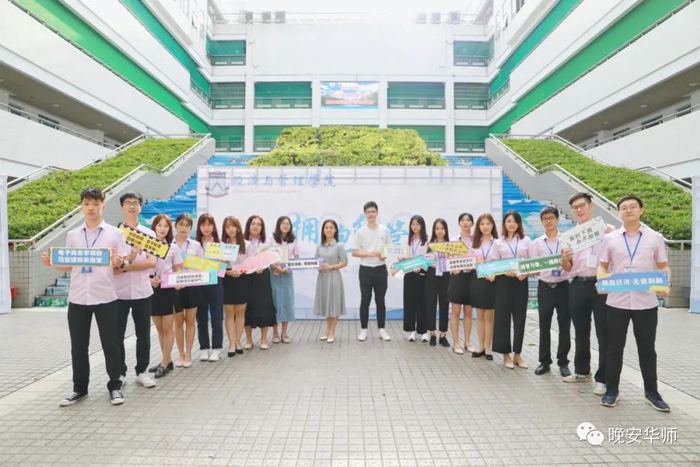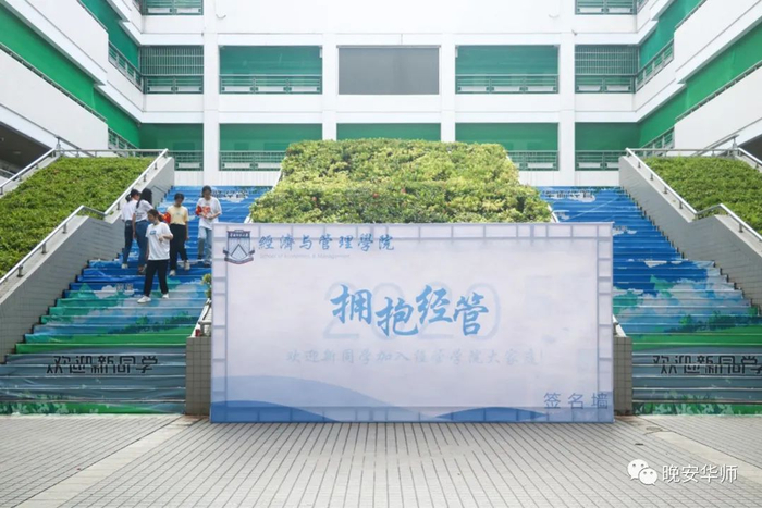 经济与管理学院(南海校区)今年设计了一款印着学院logo的鼠标垫作为新生专属入学礼,同时在学院门口处设置签名墙和拍照墙,供新生拍照留念。